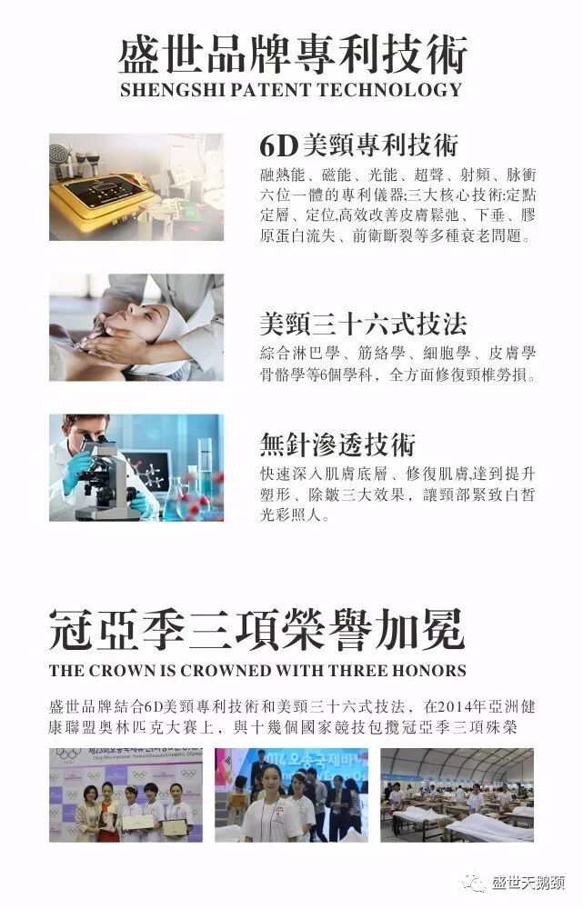 盛世集团,专注颈部抗衰护理;旗下拥有法姿纯、欧黛尔、曼雅诗等健康养生品牌。盛世集团,联手全球最大的生物学研究机构—法国CNRS植物分子生物学研究所,历经30余年的研发与市场应用,成功研制高科技ARL生长因子;其分子量小、渗透性强;采用最先进的无针渗透技术,达到肌肤快速吸收与修复效果。